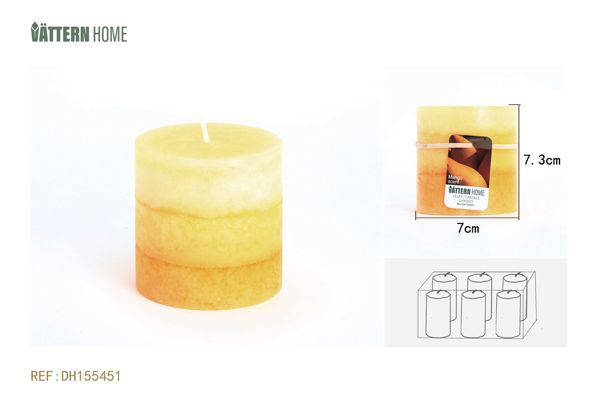 Vela de tres colores en forma de pilar de 7 x 7,3 cm con parafina y sabor a mango (amarilla) que dura 30 horas