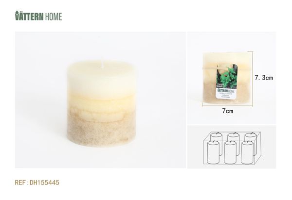 Vela de tres colores en forma de pilar de 7 x 7,3 cm con parafina y sabor a vainilla (blanco lechoso) que dura 30 horas